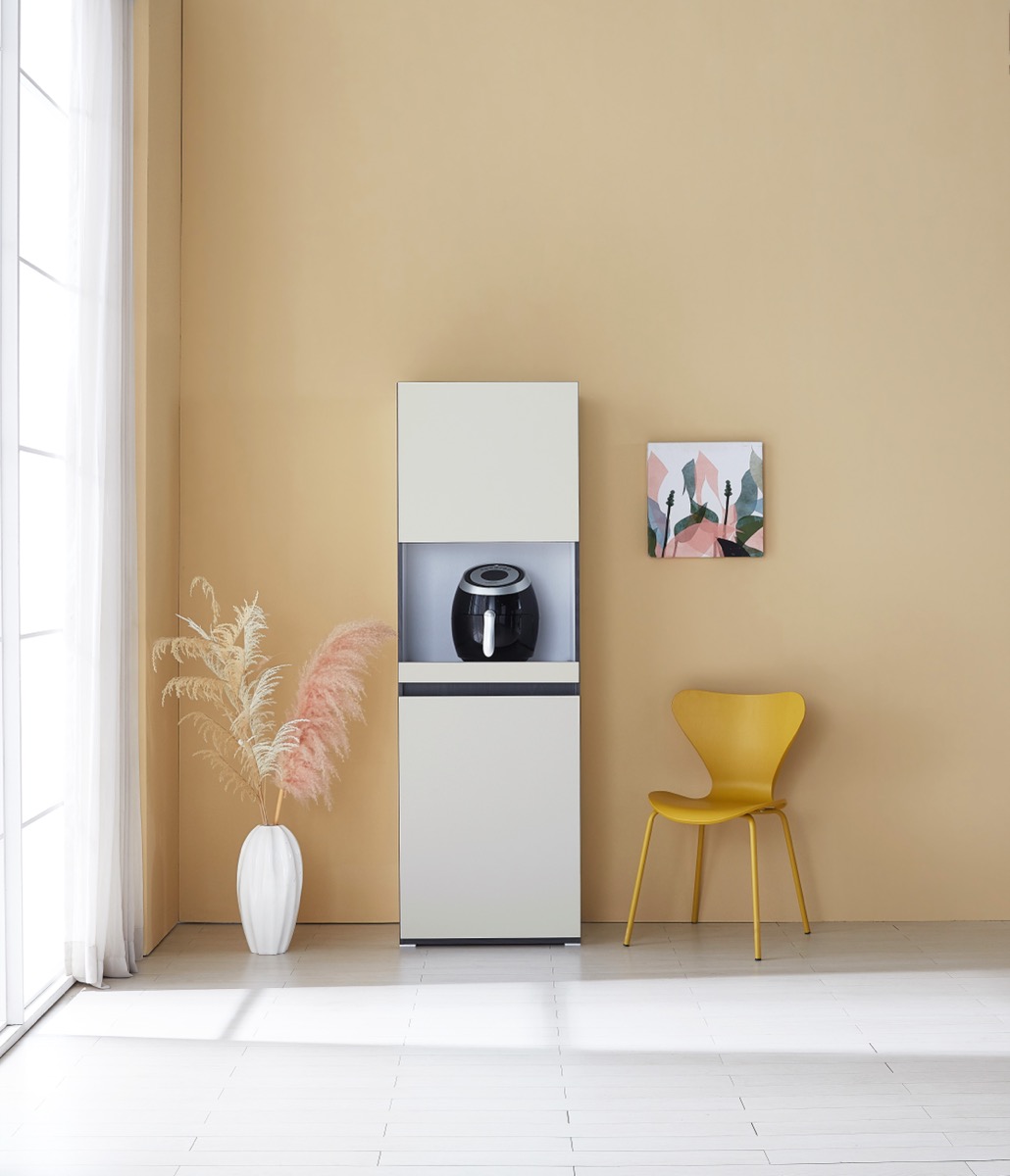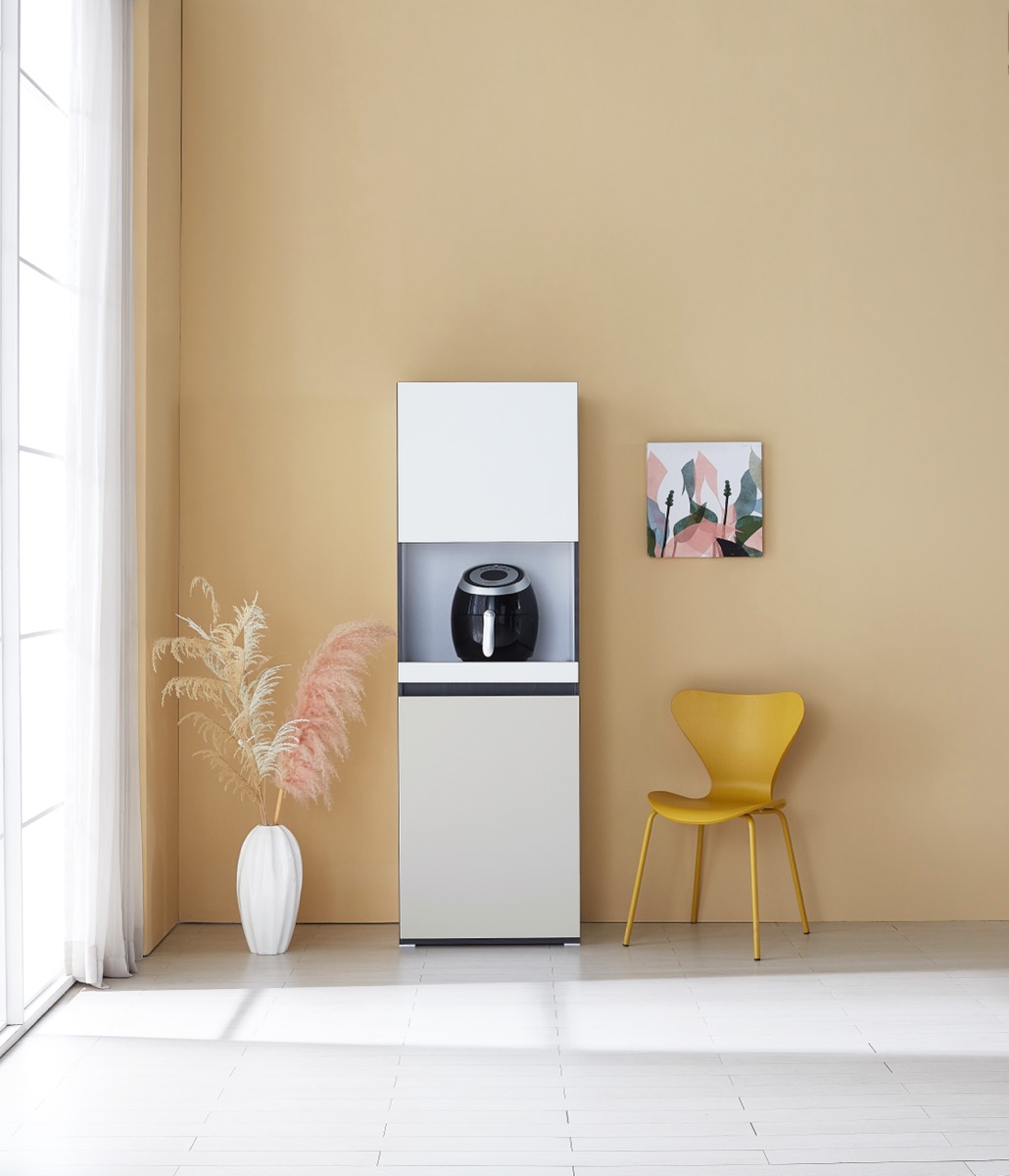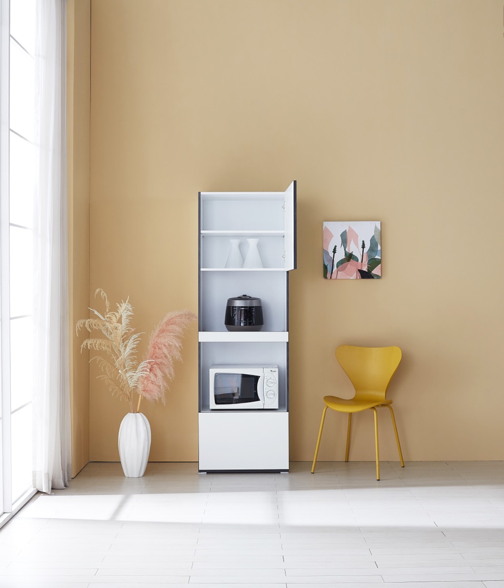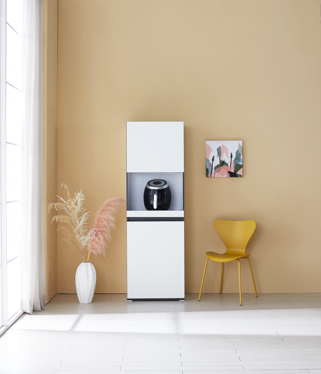 밥솥 전용 슬라이딩 선반 탑재. 냉장고 옆 틈새를 활용해 주방을 넓게 씁니다.