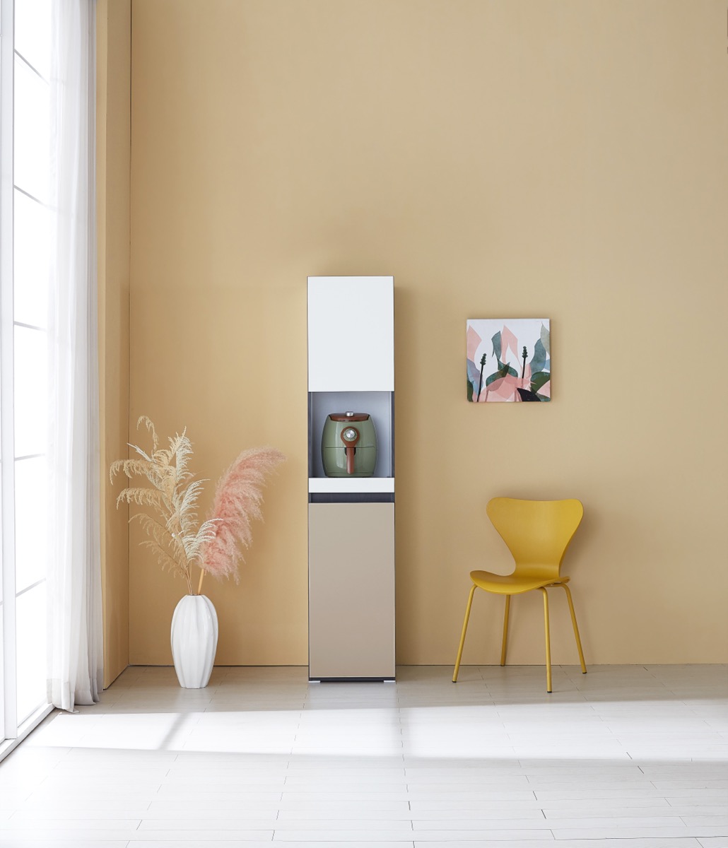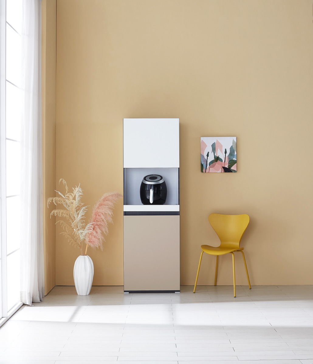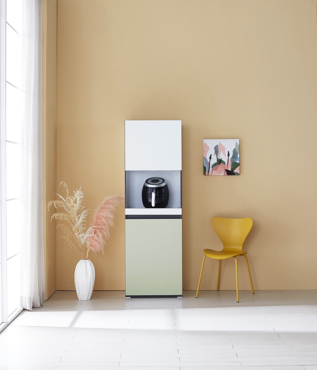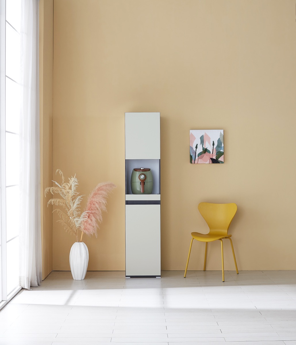 밥솥 전용 슬라이딩 선반 탑재. 냉장고 옆 틈새를 활용해 주방을 넓게 씁니다.