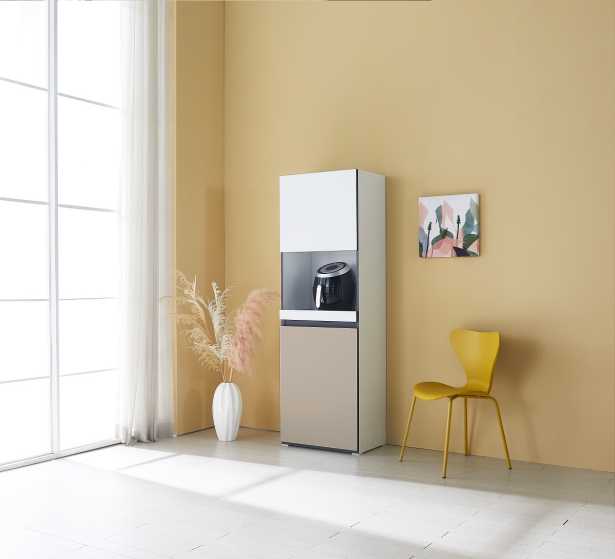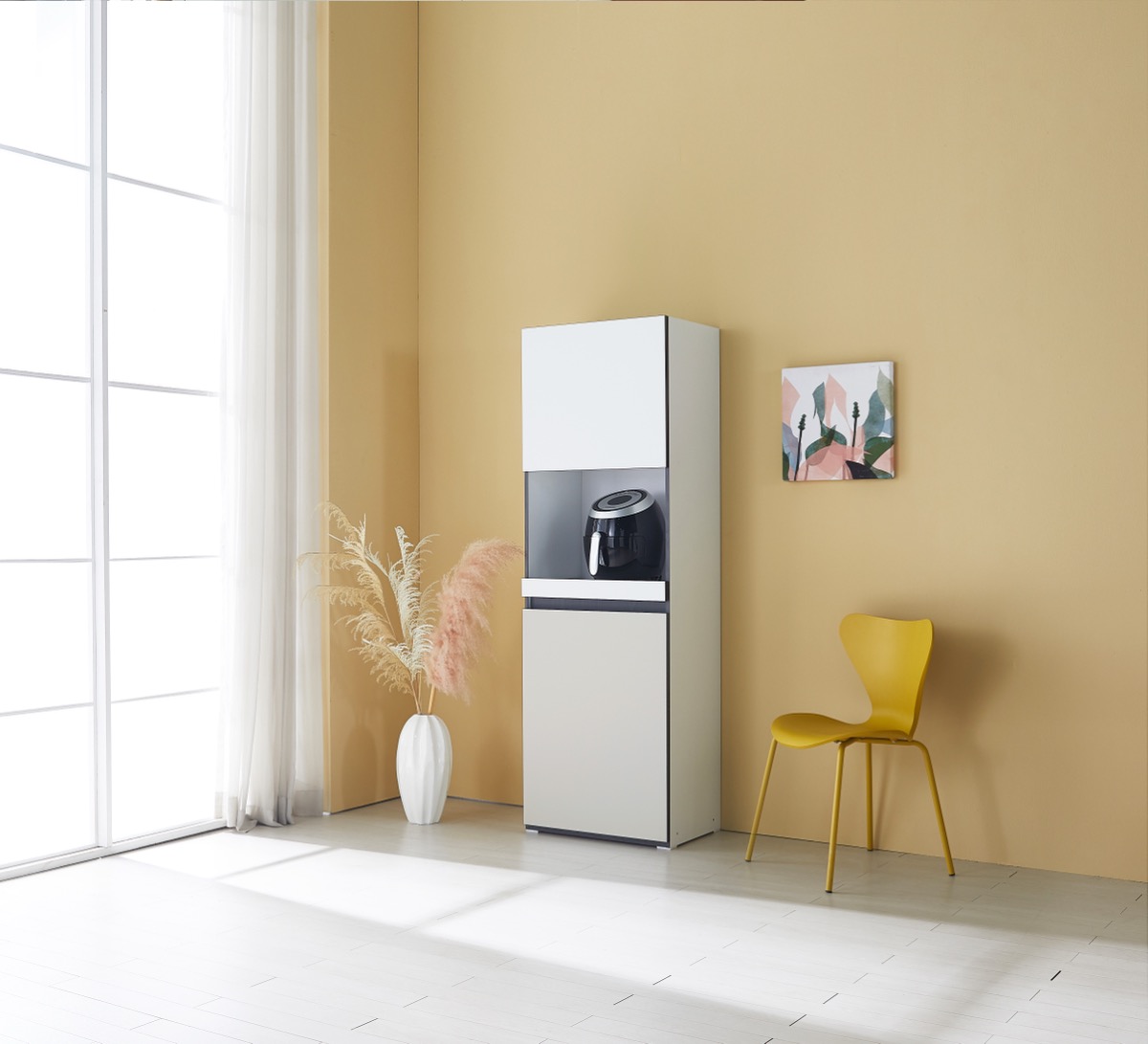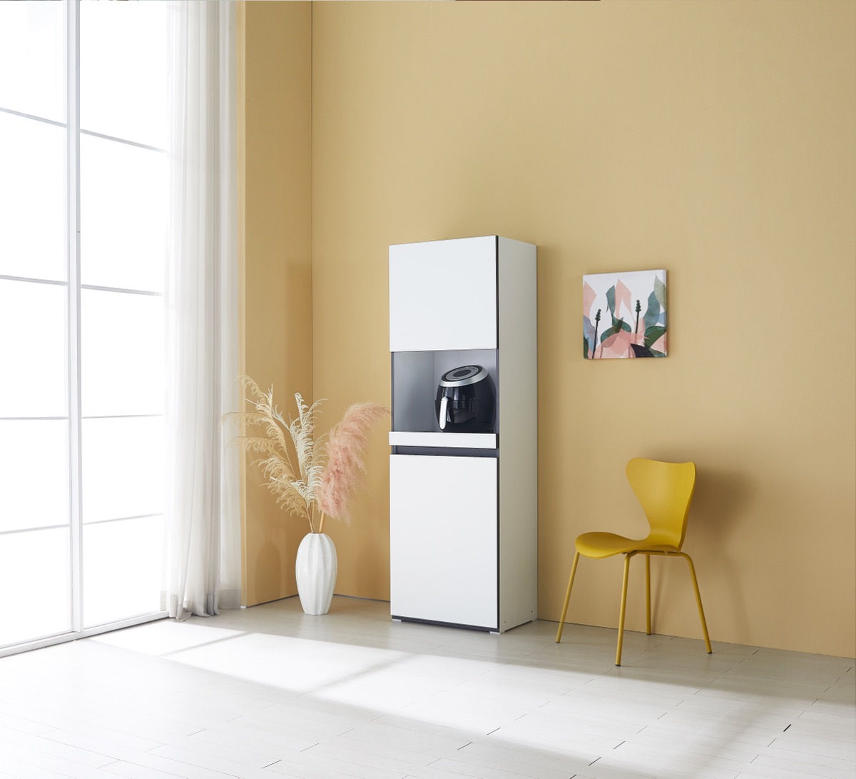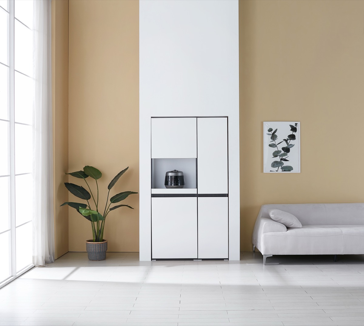 밥솥 전용 슬라이딩 선반 탑재. 냉장고 옆 틈새를 활용해 주방을 넓게 씁니다.
